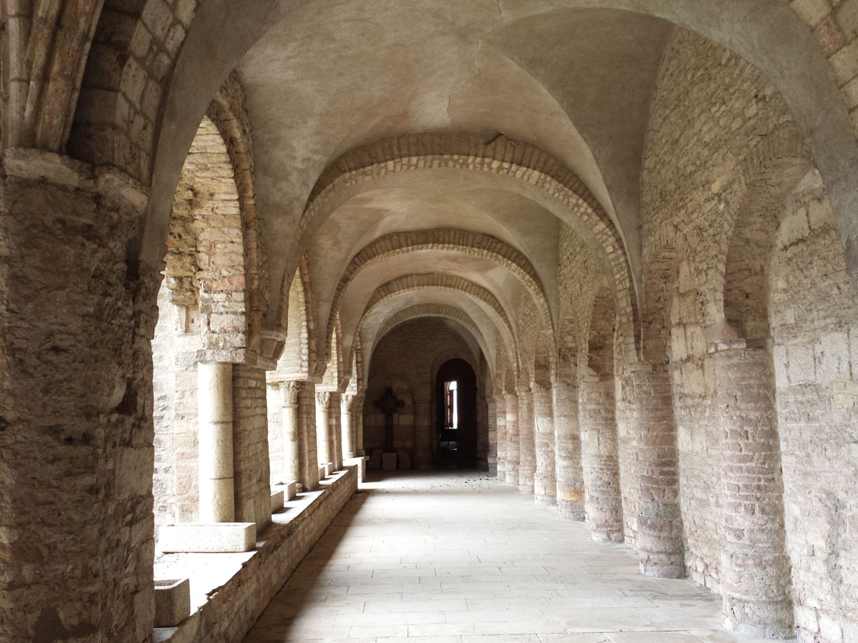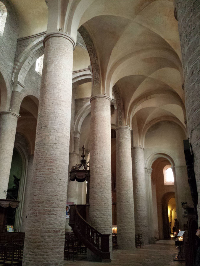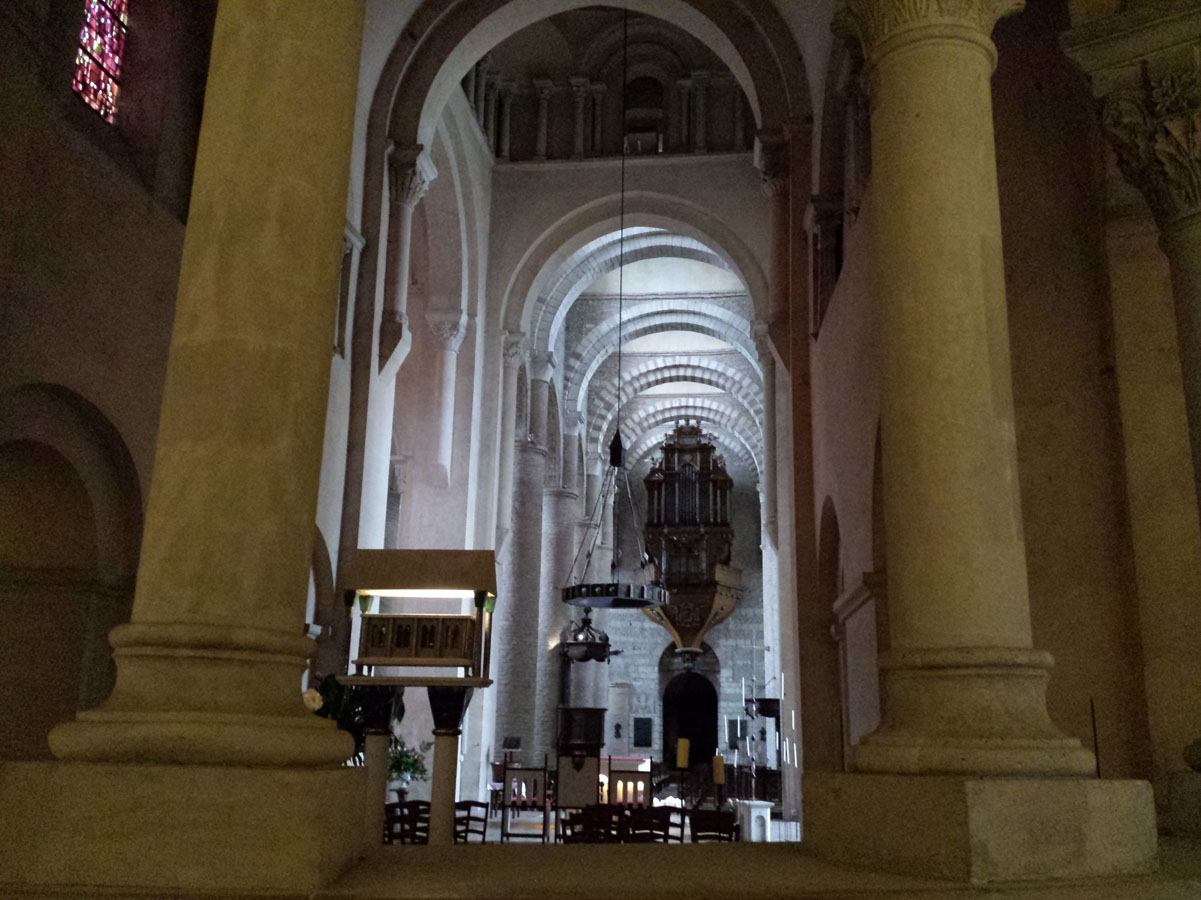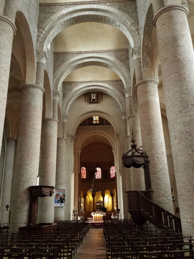On entre dans un imposant vestibule (le narthex), un endroit très sombre, avec d’imposants piliers ronds de pierres brutes; on descend quelques marches pour pénétrer dans la nef centrale par une allée surprenante de luminosité – pour une église romane. On admire la hardiesse des voûtes (plus de 18 mètres !), l’impression est étonnante. Une technique de voûtage pratiquement unique a été mise en œuvre: la voûte en berceau transversal. Chacune des 5 travées est couverte d’une voûte de pierre en plein cintre, dans sa largeur, s’appuyant ainsi sur sa voisine au lieu de peser lourdement sur les murs latéraux.
