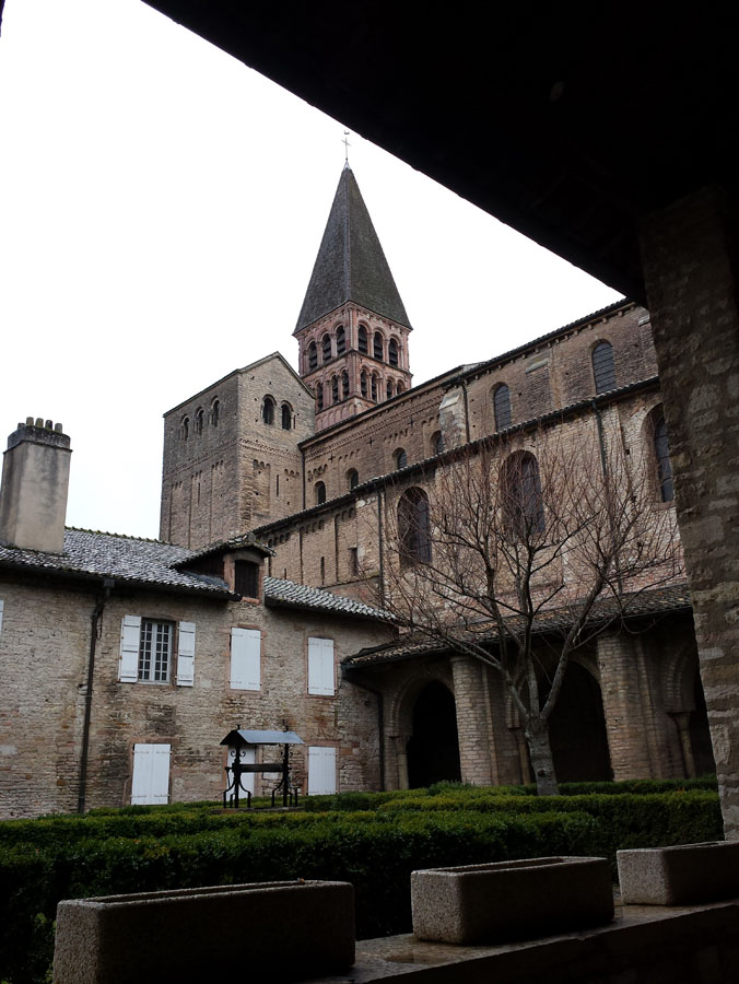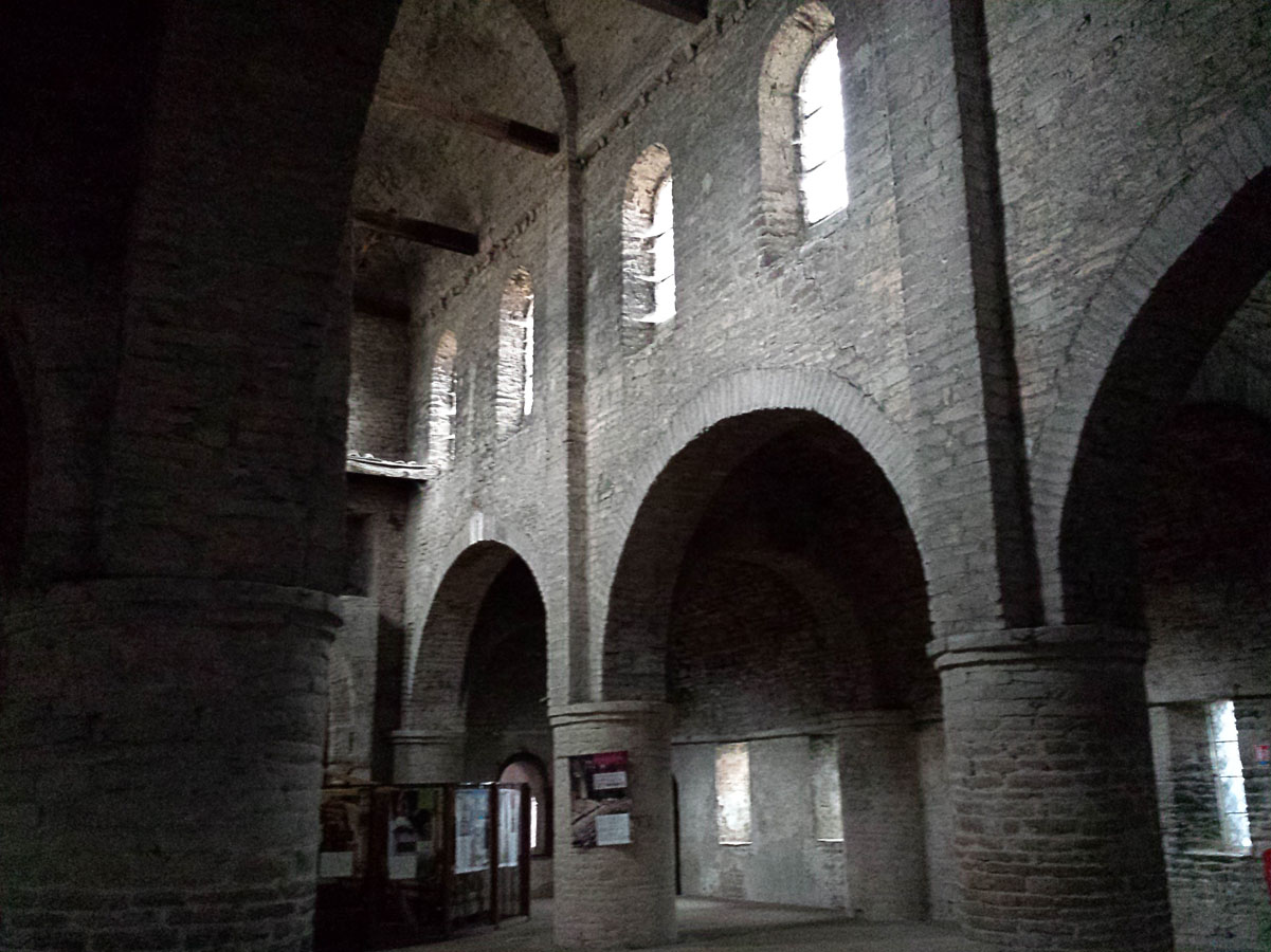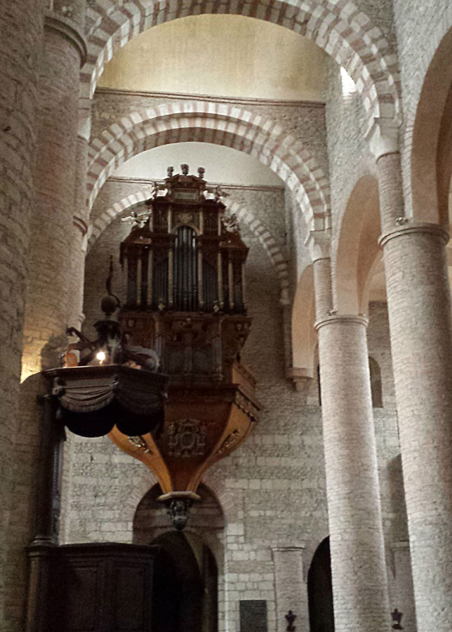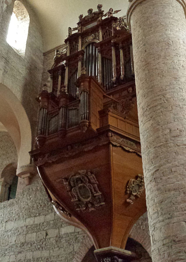 On entre dans un imposant vestibule (le narthex), un endroit très sombre, avec d’imposants piliers ronds de pierres brutes; on descend quelques marches pour pénétrer dans la nef centrale par une allée surprenante de luminosité – pour une église romane. On admire la hardiesse des voûtes (plus de 18 mètres !), l’impression est étonnante. Une technique de voûtage pratiquement unique a été mise en œuvre: la voûte en berceau transversal. Chacune des 5 travées est couverte d’une voûte de pierre en plein cintre, dans sa largeur, s’appuyant ainsi sur sa voisine au lieu de peser lourdement sur les murs latéraux.