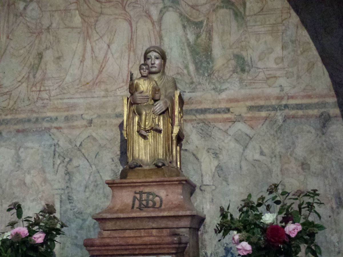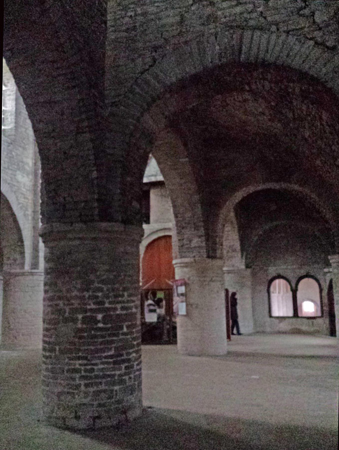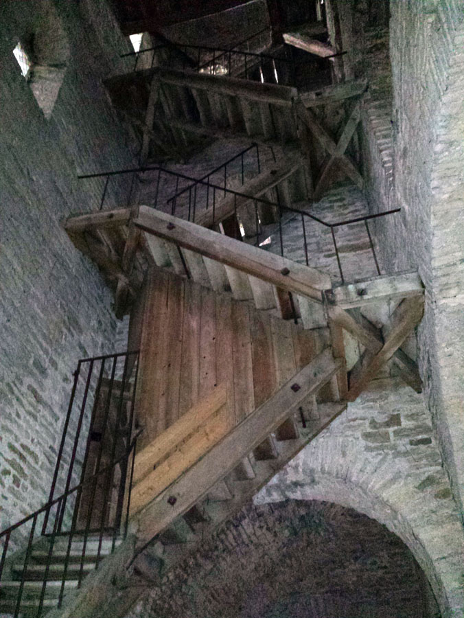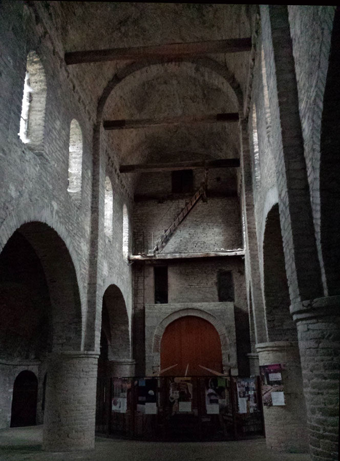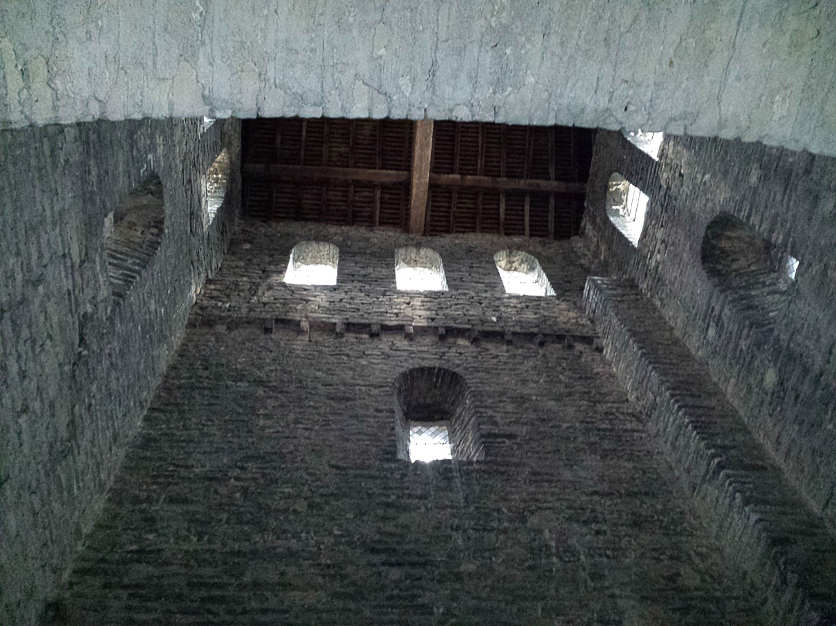 Retour dans l’église, on emprunte près de l’entrée un escalier assez raide pour aller à la chapelle Saint Michel et là, deuxième surprise, ce n’est pas une humble chapelle mais une nouvelle, vaste et haute église qui s’offre à nous, comme un étage se superposant à l’église inférieure, avec ses piliers et demi-piliers ronds qui s’élancent vers la haute voute et supportent la superstructure et les clochers, sans aucune charpente apparente. Un escalier de bois monte en zig-zag le long d’un mur de refend pour accéder aux combles, interdits d’accès.