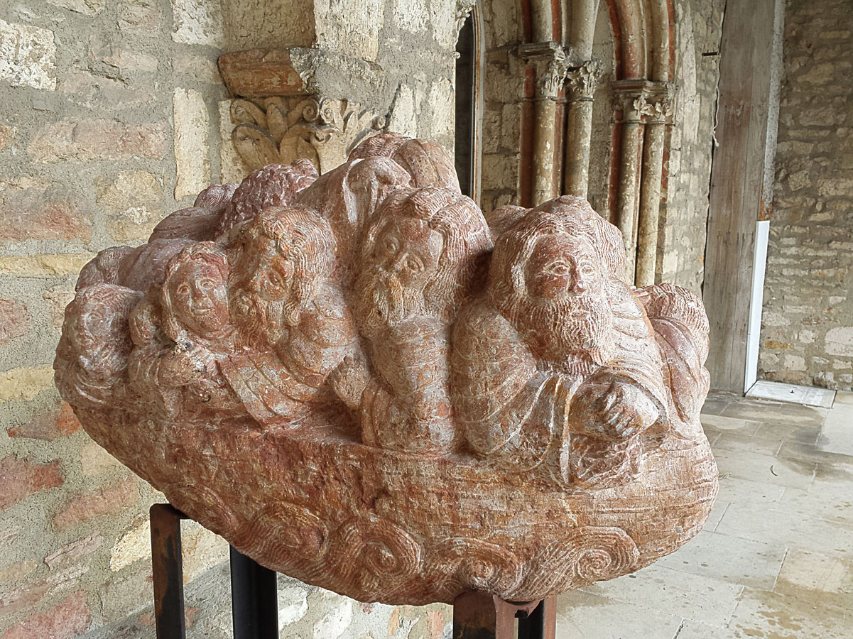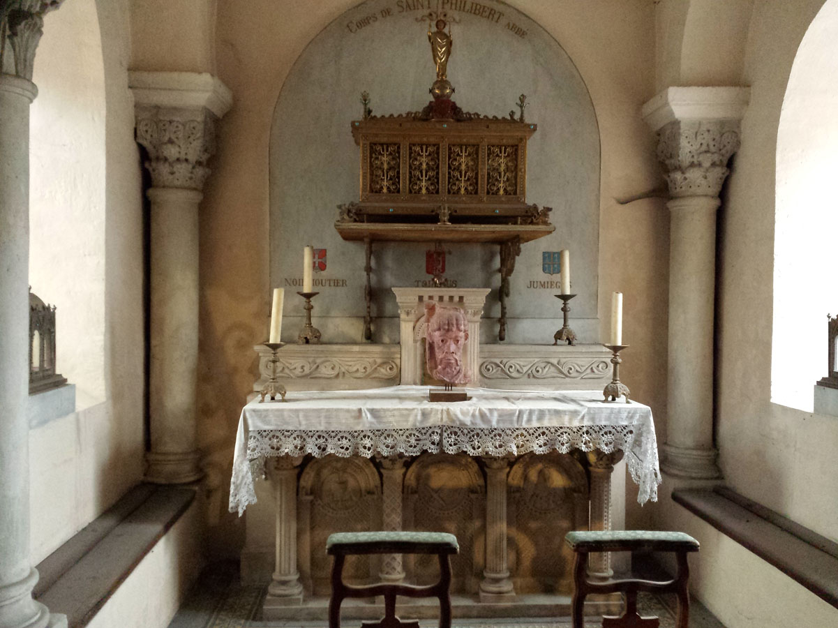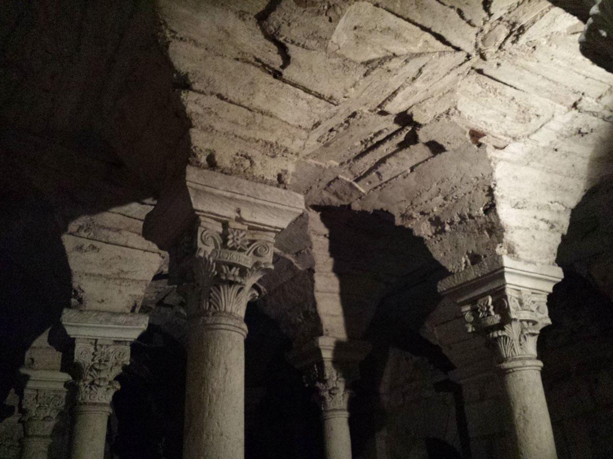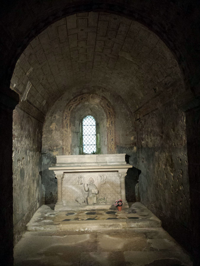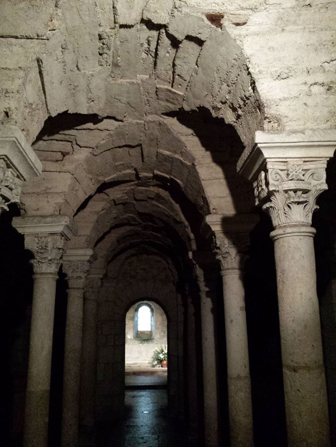 Puis on descend vers la crypte (attention la tête!), une église semi enterrée située exactement sous le chœur, avec ses colonnes de récupération de monuments antiques , sa voute surprenante avec son mortier brut de décoffrage, ses chapelles rayonnantes.
